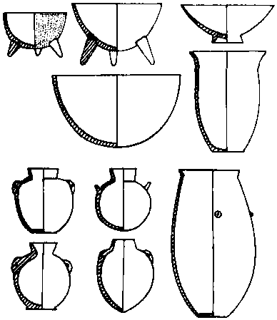 裴李岗的陶器 裴李岗文化产生于河南新郑、郑州、尉氏、中牟、密县、巩县、登封、长葛、鄢陵、郏县、项城、潢川等县,出现石器、陶器、房屋、墓地、家畜,陶器呈红褐色,手工制作,陶壁厚薄不匀,火候较高,在900~960℃之间,这是中国最早的成批陶器(如图)。 磁山文化产生于河北武安磁山及冀南、豫北等地。房屋建筑和墓葬情况与裴李岗文化相似,农作物主要是粟,家畜有猪、狗、牛、鸡。该处民族在世界上最早种粟和养鸡,陶器也多为红陶或褐陶,比裴李岗文化要粗糙。 前6000年埃及中部尼罗河东岸巴大里哈马米亚村,出现新石器,有磨制精致的石斧、石锄和石制锯齿镰刀。工具中有铜锥出现,人类制造生产工具和生活用具的技术已超出石器时代。 前6000年河南新郑地区出现细石器。其中磨制石器多于打制石器,最有代表性的是带足磨盘、带齿石镰和双刃石铲,它们在农业生产中占据重要地位。 前6000年埃及巴达里文化产生于尼罗河东岸哈马米亚村(位于今巴达里城所属地区)。当地有居民聚居点和墓葬,居民种植大麦、小麦,能用麦粉做面包、煮粥。已有烧煮食物的沙锅、匙、碗、瓶、水杯等陶器,陶器外壁饰有多种图案和花纹。还有象牙造器皿和石制器皿,以及用象牙或黏土制作的妇女雕像,且多是母亲给孩子喂奶的形象。妇女的墓也比男子大,显示了当时正处于母系氏族繁荣时期。 |