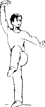 武术平衡动作之一。为上体正直,一腿支撑,另一腿屈膝高提收控于体前。两臂可成不同姿势,右臂上举,掌心向上,左臂后伸成勾手,称为提膝勾手亮掌。动作要领:前腿提膝要对腰,小腿屈紧,脚尖绷直内收,平衡站稳。教学重点:❶增加提膝高度。可加强大腿后群肌柔韧性和髂前肌的力量练习。❷提高动作的稳定性。可反复做身体直立抱膝贴胸的静止练习。