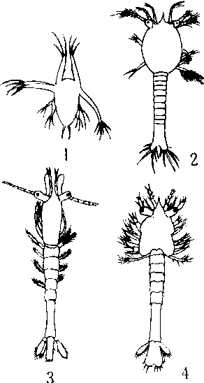 1. 无节幼体 2. 溞状幼体 3. 仔虾 4. 糠虾幼体