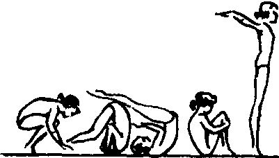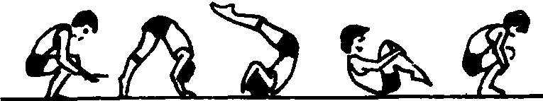 保护与帮助 保护者一腿跪撑, 一腿蹲撑在练习者侧前位置;当其滚动至臀部着垫时,两手顺势推其背部, 帮助成蹲立。 教学重点 ❶头、背、腰、臀依次着垫滚动,切勿早或晚低头。 ❷蹬地后两腿先直后屈两手主动抱膝、跟肩。 |
