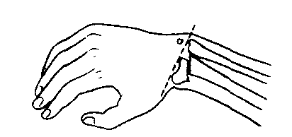 | 释义 | 前臂远端骨折病人的护理桡骨下端骨折,多为传达暴力所致。如跌倒时手腕部着地而骨折。伤后腕部关节肿胀,活动受限有典型的餐叉样畸形(图2—2—31)。X线片可见骨折平面距腕关节2~3厘米内,骨折远端向背侧移位并向桡侧偏,骨折近端相对移向前方凸向掌侧。这种骨折在门诊治疗即可不需住院。先整复后用石膏或夹板固定,用三角巾或带悬吊胸前。要注意患肢血循环情况,病人不得自己或叫家属移动夹板位置,如疼痛或肿胀加剧,手指皮肤青紫、冰凉发麻等情况应立即返院就诊。整复以后立即可以做掌指关节活动(伸展五指握拳),有助于肿胀消退。还应尽早开始肩、肘关节的活动,以免发生肩关节僵硬的现象。