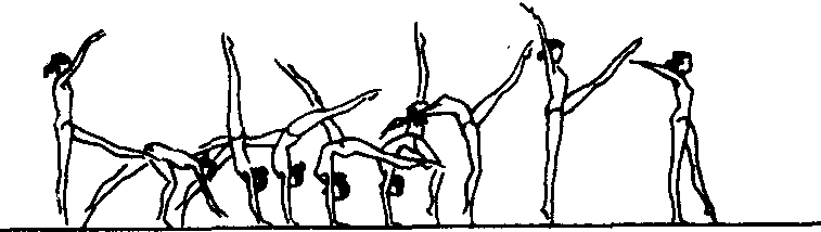| 释义 | 前软翻经手支撑,充分利用肩、胸、腰、髋的柔韧性做经头的向前翻转(没有腾空) 1周的动作。动作要领(以单腿前软翻为例):两腿前后站立,两臂前上举,重心前移,上体前倾,两手撑地,右腿向后上摆,左脚蹬地,经前后分腿手倒立后,肩稍后引,身体尽量后屈,抬头,右脚尽量在靠近手的地方落地并迅速将重心移到右脚上,同时顶肩、推手、顶髋、立腰,左腿向前上方伸出于体前点地,还原成开始姿势。保护与帮助:保护者站在练习者侧面,一手扶他的肩部,另一手托其腰部。教学重点:在帮助下,做经前后分腿手倒立前翻成一腿上举的“桥”,再由“桥”顶肩还原的练习,体会顶肩、立腰、推手配合技术,然后在助力下做完整动作练习。