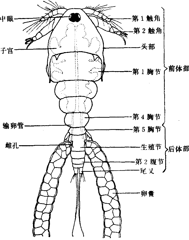 图152 剑水蚤类体制模式图 剑水蚤Cyclops无脊椎动物,节肢动物门,甲壳纲,剑水蚤科。身体细小,呈圆锥形,但背面微隆起,腹面较平。体节明显。无鳃和心脏。用体表呼吸,血液靠体内肠的蠕动而流动。雌体所产的卵,藏于卵囊中,卵囊常挂附在腹部两侧。发育过程有变态。分布于各地淡水水域中,这种浮游动物也是鱼类的天然饵料。 剑水蚤Cyclops甲壳纲,剑水蚤科。体细小,长1~3 mm。头胸部呈卵圆形,腹部细长。无复眼,仅有中眼。有触角两对。第一触角大而发达,用以游泳,在雄体弯曲成抱握肢。胸肢6对,行跳跃运动。腹部3节,无附肢,末端有尾叉一对,各有一簇尾毛。雌体腹部两侧常携挂卵囊一对。体内结构简单,无心脏、无鳃,仅有一消化道。间接发育。淡水产,为浮游生物重要的组成者,鱼类等的食饵,但有些种类是阔节裂头绦虫的中间宿主。如英勇剑水蚤(C.strenuus)、近邻剑水蚤(C.vicinus)。