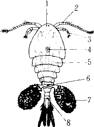 剑水蚤 1.眼 2.第一对触角 3 . 第二对触角 4. 卵巢 5.子宫 6.生殖孔 7.卵囊 8 . 肛门 |