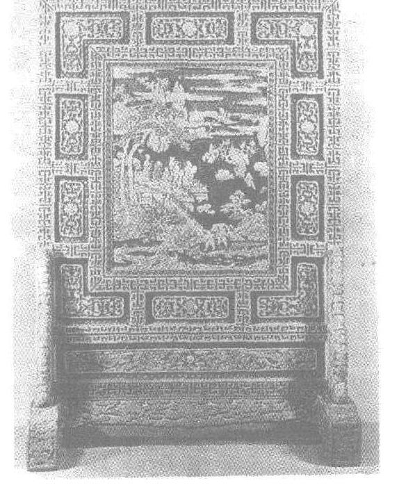 | 释义 | 剔彩八仙博古图插屏清中期。高74.6厘米,宽49.4厘米。北京故宫博物院藏。宫廷陈设品。长方形,髹红、绿、黄三色漆数层后,遍剔纹饰:屏心一面雕刻八仙拥立于琼台上,拱手迎接来自仙山祥云间骑鹤而至的寿星,寓以“八仙庆寿”之意。另一面刻博古图。屏框在繁密的拐子纹间,刻折枝花卉。剔彩见“剔彩百子晬盘”条目。