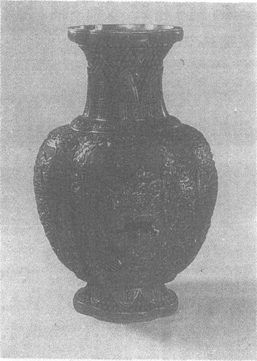 清中期。高42厘米。北京故宫博物院藏。盘口、长颈、鼓腹、圈足。表面绿漆地上遍饰剔红纹饰。颈、足为蕉叶纹、锦纹、莲瓣纹,腹部四面开光,内饰八仙祝寿图,外饰缠枝莲花纹。瓶造型稳重,刻法严谨,既有浑朴圆润的一面,也有纤巧细腻之长。剔红见“剔红兽环钵”条目。