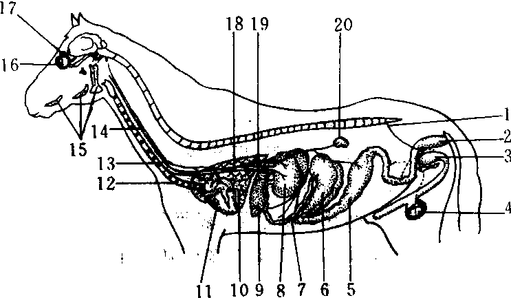 马的副交感神经分布图 (实线示节前神经纤维,虚线示节后神经纤维) 1.盆神经 2.直肠 3.膀胱 4.睾丸 5.大结肠 6.盲肠 7.小肠 8. 胃 9.肝 10.肺 11.心 12. 气管 13.食管 14.迷走神经 15. 唾液腺 16. 眼球 17. 泪腺 18.迷走神经食管背侧干 19. 迷走神经食管腹侧干 20. 肾 |