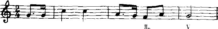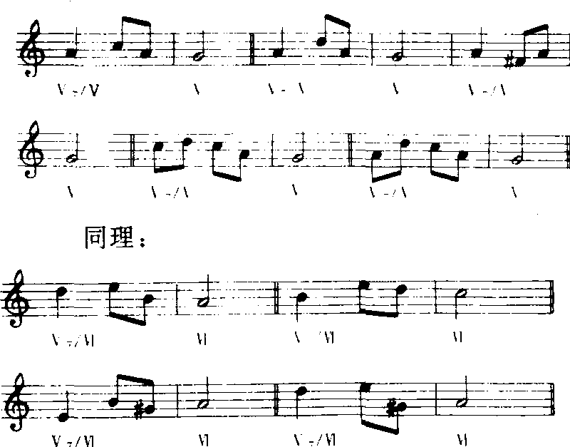 这里的Ⅴ前面小节有“fa”出现,就不能用Ⅴ7/Ⅴ,只能用‖6→Ⅴ的进行了。前面有 “sol”音出现,也不能用Ⅴ7/Ⅵ→Ⅵ的进行。