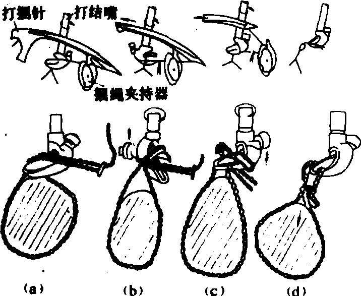 图1 日本小型割捆机 1.打捆装置; 2.行走轮; 3.压束弹簧; 4.茎秆输送装置; 5.发动机;6.扶禾器 主要工作部件 包括拨禾扶禾装置、茎秆切割装置、茎秆输送装置、打结装置等。工作时,作物由拨禾扶禾装置导入茎秆切割装置后,由往复式切割器切割禾秆,而后经茎秆输送装置送到打捆装置,经捆扎打结后,由拨捆杆将禾捆推落地面。 打结装置是割捆机最重要又最复杂的部分,主要由打捆针、茎秆压实器、打捆器离合机构、打结嘴、捆绳夹持器和割绳刀等组成。捆禾打结的工作过程如下:当禾秆在台面上积聚到一定数量后,打捆器离合机构起作用,打捆针转动,同时捆绳从打捆针孔中引出并围住禾秆,捆绳两端被打结嘴在上方托住[图2(a)];打结嘴转动,将两股绳缠绕在打结嘴上[图2(b)],打结嘴继续转动并张开上颚,将两股绳咬住闭合后成扣结[图2(c)];割绳刀切断捆绳,同时拨捆杆将禾捆推出落地,在推出过程中禾捆拉紧捆绳扣结,并使其从打结嘴中脱出[图2(d)],完成捆禾打结过程。 捆绳 有麻绳(马尼刺麻、西沙尔麻、黄麻等)和聚丙烯塑料绳,大型割捆机上使用马尼刺麻和西沙尔麻捆绳,日本的小型割捆机上使用黄麻或聚丙烯绳。4股的黄麻绳1克重约0.3米,抗拉载荷400~450牛;聚丙烯绳1克约0.69米,抗拉载荷450牛左右。小型割捆机收获每亩水稻约需麻绳2千克或聚丙烯绳1千克。
