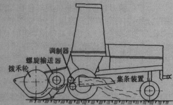 割草调制机 拨禾轮常采用喂入和铺放性能好的凸轮控制式,同时其转速常能达到很高(拨禾轮圆周速度达到前进速度的2倍),且可安装在机器的前下方,这样,使割草调制机可以在牧草严重倒伏的情况下工作。 调制器按作用原理可分为滚压式、冲击式和梳刷式三种。滚压式调制器应用广泛,它由一对相对转动的辊子组成。按照辊子表面形状,分为压扁辊和碾折辊两种。压扁辊是光面,可进行牧草茎秆的压扁。碾折辊带有沟槽,能对茎秆每隔2.5~5厘米进行横向弯折和碾裂。辊子由钢制,直径为150~250毫米,表面圆周速度为7~9米/秒。两辊由弹簧作用而相互压紧,压紧力为每米辊长4.4~5.3千牛。碾折辊的两辊径向重叠量为9~16毫米,以形成牧草的弯折和碾裂。有时碾折辊由硬橡胶制,带有人字形沟槽,同时起压扁和碾折作用。冲击式和梳刷式调制器的工作部件分别为冲击转子和梳刷转子,工作时由旋转的转子将牧草茎秆表面的角质膜刷掉,以加速内部水分蒸发,起到调制作用,但牧草损失较大,因此这两种调制器应用较少。 调制器的辊子长度一般为2米左右,具有旋转式切割器的割草调制机,切割器割幅往往和调制辊工作幅相同,称为全幅调制式,此时在切割器和调制辊之间不需要输送器。小型的具有往复式切割器的割草调制机也属于全幅调制式。往复式切割器割幅大于调制辊长时,需有输送器。输送器有螺旋式和输送带式两种。螺旋式输送器为横向配置,将两侧牧草向中央输送,然后由调制辊进行调制。输送带式输送器也分成左右两段横向配置,将割下的牧草送向中央并落于地面,形成位于中央的草条,调制辊再捡拾草条并进行调制,然后经过集条装置落于地上。带输送带式输送器的割草调制机,其调制器往往是可拆的,拆去后即成为割晒机,可用来收获谷物。 集条装置是两块向后收缩的倾斜板,以便集成较窄的草条。集成的草条宽度为1~1.2米。 |