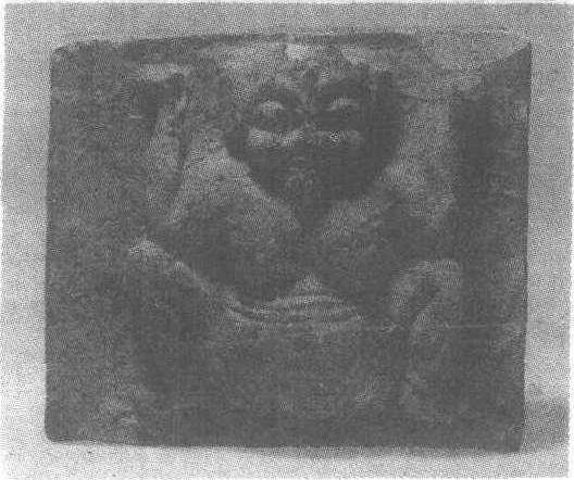 东汉。长20厘米,宽18厘米。1982年青海省平安县汉墓出土。青海省文物考古队藏。力士袒胸露腹,双脚外撇,呈八字形,屈膝蹲于地上,双肘拄膝,手举至头顶。其四肢短粗,膀大腰圆,肌肉丰实,为常见的汉代负重力士形象。