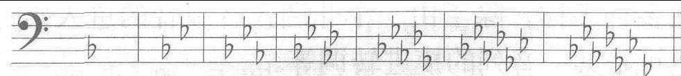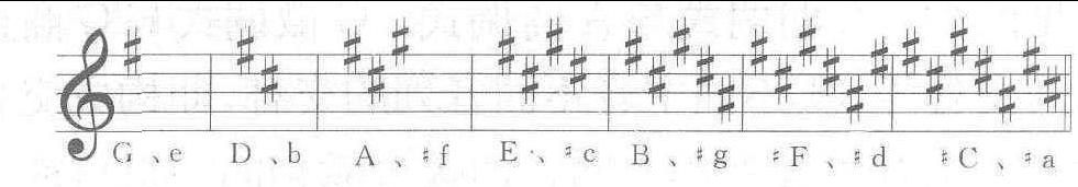 调号的升降记号,位置是固定的。第一个升号,G谱表记在小字二组F(第五线)上,F谱表记在小字组F(第四线)上; 第一个降号,G谱表记在小字 一组B(第三线)上,F谱表记在大字组B(第二线)上。 |