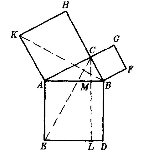 图4 欧几里得《原本》中是用全等三角形和面积证明的.如图4,在△ABC中,∠ACB=90°,分别以AB,BC,CA为边向三角形外作正方形ABDE,BFGC,CHKA.作CL⊥DE于L,交AB于M.可证△AEC≌△ABK,矩形AELM=2△AEC,正方形CHKA=2△ABK,因此,矩形AELM=正方形CHKA.同理矩形BMLD=正方形BFGC.正方形CHKA+正方形BFGC=正方形ABDE,即AC2+BC2=AB2.