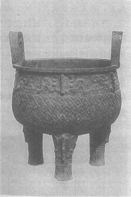 西周。炊器,礼器。通高85厘米,口径63厘米。1973年陕西省长安新旺村出土。西安市文管会藏。此鼎双立耳,鼓腹,三柱足。立耳外侧饰相对龙纹。口沿下有一圈由相对夔纹合成的饕餮纹带,间隔以短扉棱。腹部饰勾连纹。三柱足上部为饕餮纹及短扉棱,其下尚有三道弦纹。鼎上夔龙皆拱身,口向下,作攫噬状。