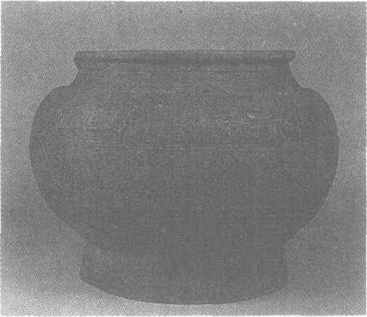 商。古代盛器。高29厘米,口径29厘米。1973年辽宁省喀喇沁左翼蒙古族自治县北洞1号窖藏坑出土。辽宁省博物馆藏。此瓿短颈,圆腹,圈足有三孔。颈部凸起三道弦纹,肩部为九组夔纹,在肩腹之间有一圈凹槽,夹以圈纹。腹部均饰勾连雷纹,圈足为变形夔纹。此器纹饰洁朴,形制规正。