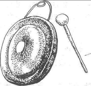 打击乐器。又称铜鼓、疙瘩锣。铜制。锣面径约300毫米,锣边较宽,锣心处有一乳状突起,高约30毫米。锣边上部有两孔,穿绳索做提手。演奏时左手提锣(或悬挂某处),右手持槌敲击。只辽宁鼓乐丧事时使用。后金(1616—1635年)时宫廷作乐时亦曾使用过。