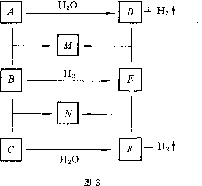 例3 图3中AB元素是同一周期,AC元素是同一主族,它们都是常见元素,原子序数均小于20,而且都是奇数,根据图示你能判断A,B,C,D,E,F,M,N各可能是什么物质吗? 答案: A钠,B氯,C钾,D氢氧化钠,E盐,酸F氢氧化钾,M氯化钠,N氯化钾。 |