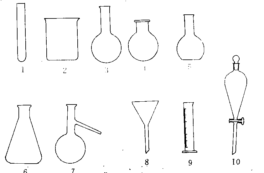 常用玻璃仪器 1. 试管 2.烧杯 3.长颈圆底烧瓶 4.短颈圆底烧瓶 5. 平底烧瓶 6.锥形瓶7.蒸馏烧瓶 8.漏斗 9.量筒 10.分液漏斗 |