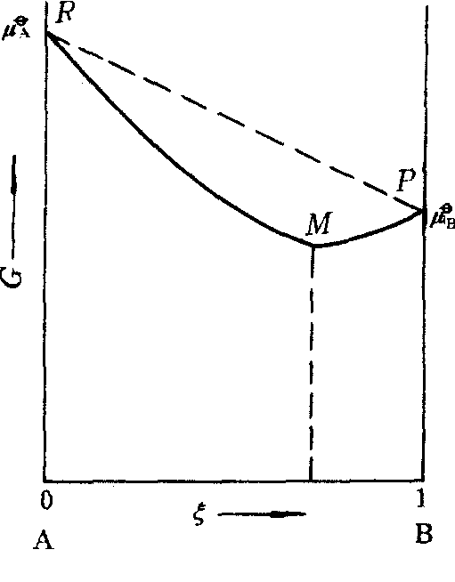 图中虚线RP为反应物A和产物B未混合反应过程中体系自由焓的变化; R点为反应前纯反应物的自由焓; P点为反应物全部转变为产物时纯产物的自由焓; 曲线RMP为A和B混合反应过程体系自由焓的变化,其中最低点M所对应的G值就是体系处于化学平衡时的自由焓,显然M点低于P点。由于反应过程产物与反应物不可能分离,使得体系的自由焓比纯产物的更低,根据自由焓判据,可逆反应是不能进行到底的。 |
