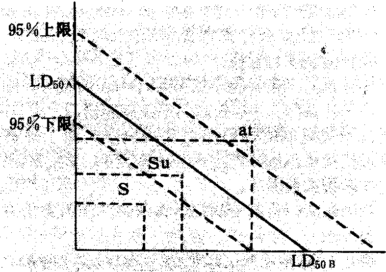 50及其95%可信限,然后以纵坐标表示A化学物的剂量范围;以横坐标表示B化学物的剂量范围。分别将两种化学物在纵坐标与横坐标上的LD