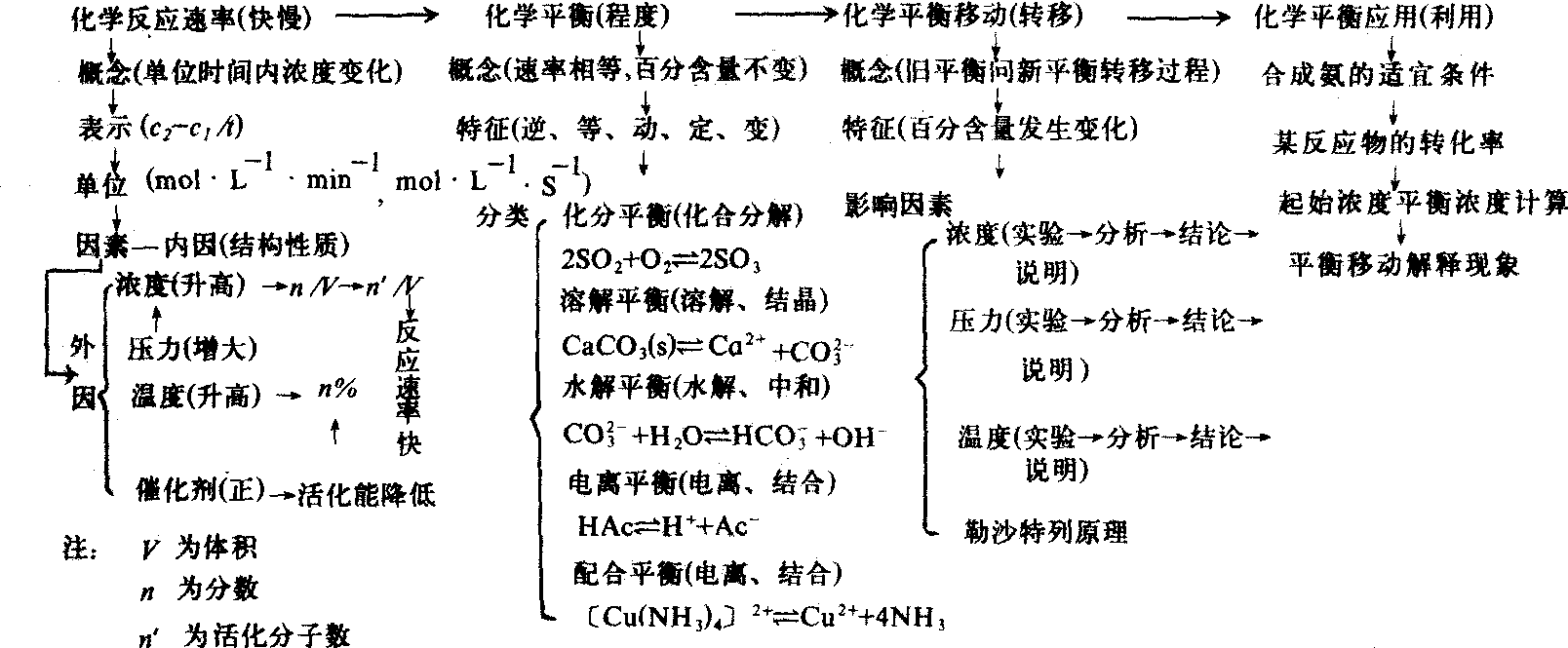 图1 化学平衡知识总结 可以有10种记忆规律,通过实例把记忆规律整理成表格。十大记忆规律为感知的记忆、理解的记忆、图式的记忆、对比的记忆、韵语的记忆、升华的记忆、联系的记忆、概括的记忆、顺序的记忆、循环的记忆。在每种记忆中均应有实例与具体内容相匹配进行展览。如,在韵语记忆中可展览“升失氧,降得还;若说性,两相反。高价氧化低价还; 中间价态两边转(氧化-还原反应)。”“三种微粒六种量,两素概念算清帐; 四种状态三原理,一套规律应记详。三键二力六数据,两种分子四晶体; 四种符号六图式,一定联系周期律。周期表格要牢记,变化体现周期律; 七主七副七周期,Ⅷ族零族镧锕系。同族金增非递减,同周金减非增递; 元素排布分四区,三角变化有联系(物质结构及周期律)。”❸理论联系实际的展览 把所学的理论 (电离平衡、化学平衡、结构理论、氧化-还原理论) 应用到元素化学知识上,以卤族为例,以结构理论为基础,卤族元素的位置、结构、性质三者的关系见图2。