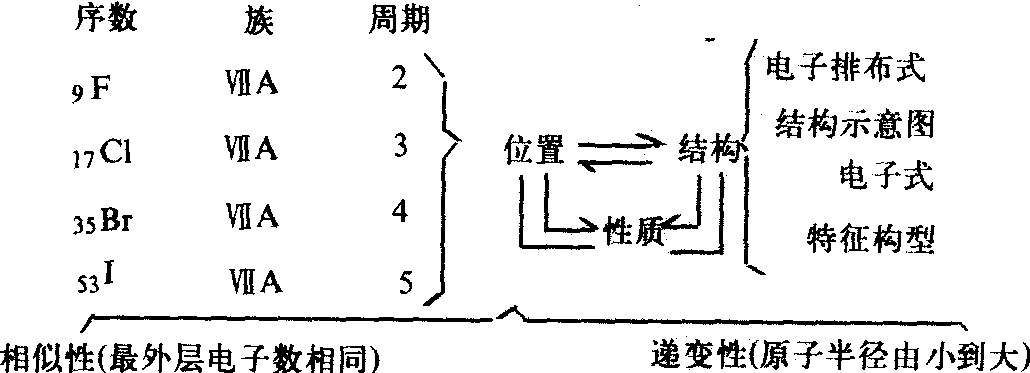1.最高正价为+1,负价为-1 1.气态氢化物的稳定性由强到弱 2.形成气态氢化物HR 2.最高氧化物的相应水化物的酸 3.最高氧化物相应水化物为酸HR4,F除外 性由强到弱 4.均为非金属元素 3. 非金属性由强到弱 图2 卤族元素的位置、结构、性质关系图 |