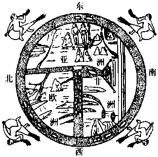 | 释义 | 789年牧师利巴涅恩西斯[西]著《启示录注释》时,附有一幅大地形状图(图)。图为圆盘形状,“有人居住的世界”占据整个圆盘,大地中间由一“T”字分割大陆为洲。“T”字的一竖表示地中海,把欧洲和非洲分开。一竖中间有一些小陆地,表示地中海中诸岛;一横的两半分别为顿河和尼罗河,圆盘的上方画有表示“天国”和“乐园”的图像。这种轮形地图表示古老民族原始的寰宇观念。