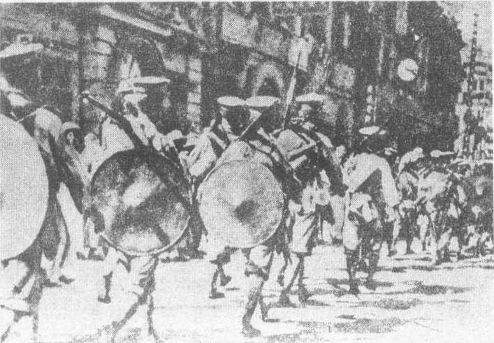 国民革命军开入汉口英租界 北伐战争Beifazhanzheng1926至1927年间,中国人民在中国共产党和中国国民党领导下,以打倒北洋军阀为直接目的的反帝反封建的革命战争。1926年2月,中国共产党明确提出出兵北伐推翻军阀统治的政治主张,得到广大人民支持。5月,叶挺独立团作为北伐先遣队首先挺进湖南。7月9日,国民革命军约10万人正式出兵北伐,蒋介石任总司令。北伐军分三路进军。主要一路为第四、第七、第八军,向盘踞在湖南、湖北的直系军阀吴佩孚部发动进攻。7月占长沙、岳州,8月在汀泗桥、贺胜桥两次战役中,击溃吴佩孚主力,10月攻下武昌。第二路由第二、第三、第六军向江西境内的直系军阀孙传芳部进攻。11月占领南昌,歼灭了孙传芳主力。第三路为第一军,向福建、浙江进军,因敌人内部分化,于12月占领两省。在北伐节节胜利的形势推动下,1927年春,两湖地区农民运动猛烈发展。汉口、九江人民驱逐英帝国主义者,收回了两地英租界。上海工人举行武装起义,占领了上海。3月24日,北伐军攻占南京。至此,盘踞在长江中下游广大地区的直系军阀吴佩孚、孙传芳的反革命势力基本上被消灭。后来由于帝国主义加紧干涉中国革命,1927年4月12日和7月15日,蒋介石、汪精卫相继在上海和武汉发动反革命政变,残酷屠杀共产党人和革命人民,北伐战争的胜利果实被他们所鲸吞。到1927年7月,这次战争宣告失败。 北伐战争1926年至1927年间国共合作进行的反对帝国主义和北洋军阀的革命战争。1926年5月,以共产党员为骨干的叶挺独立团向湖南挺进,揭开了北伐战争的序幕。7月9日国民革命军约10万人誓师北伐,蒋介石任总司令。北伐军主要一路为第四、第七、第八军,向湖南、湖北进攻。7月攻占长沙、岳州;8月经汀泗桥、贺胜桥两次战役,击溃吴佩孚主力;10月攻占武昌。第二路为第二、第三、第六军,向江西进攻,11月攻占南昌,歼灭了孙传芳主力。第三路由第一军向福建、浙江进军,12月占领福州。3月北伐军占领南京,北伐取得了重大胜利。由于帝国主义加紧干涉中国革命,国民党右派蒋介石和汪精卫先后在上海和武汉发动反革命政变,致使第一次国内革命战争归于失败 北伐战争1926年至1927年间,中国人民在中国共产党和中国国民党的共同组织领导下进行的反对帝国主义和北洋军阀的革命战争。1926年7月9日,国共合作的广州国民政府组织了国民革命军8个军约10万人誓师北伐,分三路进军。主要一路为湖南湖北战场,相继攻占长沙、岳州、汀泗桥、贺胜桥、武汉,击溃了吴佩孚军阀的主力。另两路为江西、福州战场,先后占领南昌、九江、福州等地,消灭了军阀孙传芳的主力。此外,冯玉祥国民军在五原誓师,占领甘肃、陕西。1927年4至6月,武汉国民政府进行第二次北伐,占领河南。北伐战争沉重打击了帝国主义和北洋军阀。由于蒋介石、汪精卫的叛变,1927年7月北伐战争夭折。 北伐战争中国国民党与中国共产党合作,组织国民革命军,于1926~1927年间,为推翻北洋军阀的统治而进行的革命战争。国民革命军8个军约10万人,战争过程中发展到40多个军近百万人,蒋介石任总司令。冯玉祥在五原组织国民联军5万人(后发展到20万人)响应北伐。1926年7月9日兵分三路正式北伐。10月10日西路占领武昌。11月8日中路占领南昌。12月9日东路占领福州。1927年3月西路军进入豫中,东路军进入上海,中路军进入南京。北伐军占领区面积达120万km2,人口1.5亿。1927年4月至7月,由于蒋介石、汪精卫相继叛变革命,北伐夭折。北洋军阀吴佩孚军约20万人,孙传芳军约20万人,张作霖军约35万人。历1年时间,基本消灭了吴佩孚、孙传芳的军队,重创了张作霖的队伍。 |