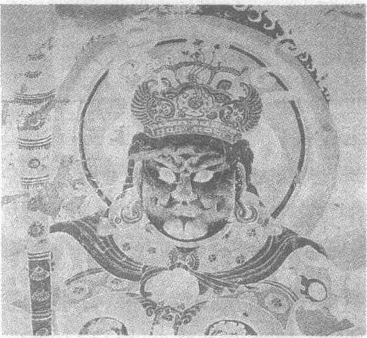 | 释义 | 北方天王头像壁画晚唐。纵70厘米,横80厘米。甘肃省敦煌县莫高窟第12窟前室西壁北侧壁画。北方天王名毗沙门,又名多闻天,是护法四天王之一。天王头戴宝冠,饰耳珰,身着甲胄,其上饰兽面纹、狻猊及团花。其形体魁梧,左手托塔,右手持杖。面形粗犷,双眉几乎拧成一团,怒目圆睁,颇具威武、勇猛的气概。其面部除双眼外晕染均已变色,但这种黑脸晕染形象更增添了艺术感染力。身体其他未变色的部位施彩淡雅柔和,画工十分细腻。天王的左侧有他所率领的天兵天将,手持兵器,张嘴怒吼,衬托出天王的刚烈。此图为晚唐时期莫高窟壁画中的优秀之作。