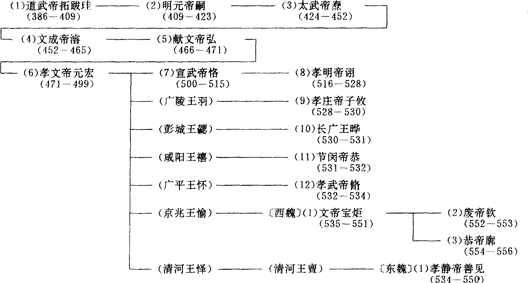 公元386年,鲜卑拓跋部酋长拓跋珪建立魏国,史称北魏,皇始三年(398)定都平城(今山西大同)。北魏先后灭后燕、夏、北燕、北凉,于太延五年(439)重新统一北方。这一年即北朝的开始。北魏初,拓跋部刚刚从部落联盟跨进阶级社会的门槛,在奴隶制尚未充分发展时,就走上封建化的道路,以适应统治中原的需要。北魏建立强有力的中央集权制,逐渐采用汉魏以来的政治制度,多方笼络汉族门阀,给予官爵,承认汉族地主荫占依附民,并把它作为国家的基层政权,这就是所谓“宗主督护制”。但是,北魏前期的民族压迫还比较严重,汉族人士经常受到猜忌,致被杀戮灭族;汉族和鲜卑族以外的少数民族人民生活艰难,不断进行反抗,仅史籍所载,当时各族人民的起义有35次,其中以盖吴领导的起义规模最大。北魏中期,冯太后实行政治、经济改革,颁行俸禄制,整顿吏治,实施三长制、均田制等。孝文帝亲政后,将都城迁到洛阳,并采取一系列改革鲜卑旧俗、推行汉化的措施,加速北魏封建化,促进民族融合。北魏社会经济有明显的发展,耕地增多,农具如耕犁、耙、锄、镰更齐全,耕作和施肥技术都有进步,粮食产量比过去增加。手工业生产如纺织、酿酒、压油、造纸、制瓷、冶铸都很发达,洛阳、邺和长安成为重要商业城市,南北往来、中外贸易甚为活跃。北魏末年,由六镇开始的各族人民大起义沉重打击了北魏的统治。武泰元年(528) 洛阳发生政变, 秀容 (今山西忻州) 的契胡族酋长尔朱荣带兵入京, 在洛阳附近的河阴杀死掌权的胡太后及王公大臣2000多人, 史称“河阴之变”。是后, 北魏分裂为东魏和西魏。