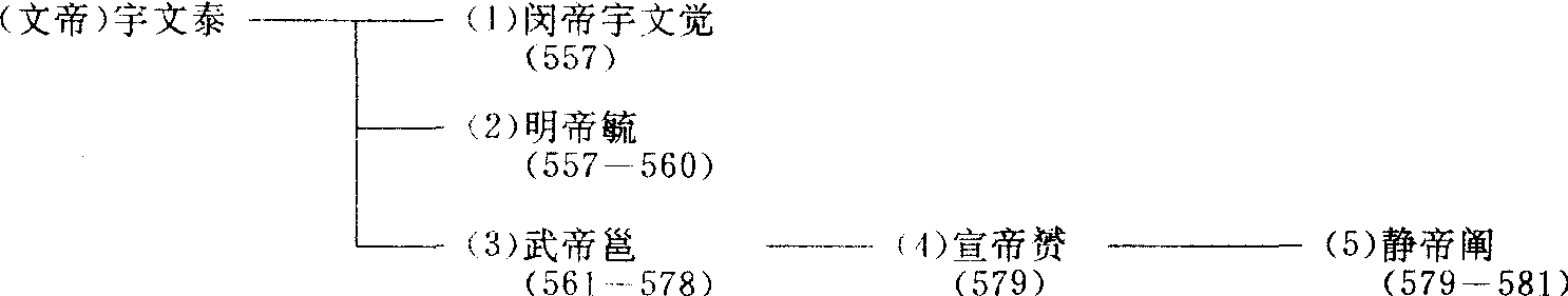 尔朱荣另一部将贺拔岳率军入关,贺拔岳死后,其部下宇文泰以这支军队控制关陇地区。孝武帝至长安,被宇文泰鸩杀。次年 (535), 宇文泰另立文帝, 都长安,史称西魏。西魏恭帝四年(557)宇文泰子宇文觉废西魏自立,国号周,史称北周。宇文泰是鲜卑人,而善于处理民族关系, 他任用苏绰实行改革, 颁行苏绰提出的《六条诏书》, 即 “先修心、敦教化、尽地利、擢贤良、恤狱讼、均赋役”(《周书·苏绰传》),作为施政纲领, 不通《六条诏书》者不得做官。又制定计帐(租赋预计数),整顿户籍,实行均田,建立府兵制。这些改革使西魏的国力不断增强。周武帝宇文邕继续推行多方面的改革, 他释放奴婢, 放免杂户 (依附民),发展农业,兴修水利,招募汉人充当府兵,禁断佛、道二教,都取得了显著的效果。建德五年(576),周武帝率军东进, 次年灭掉北齐, 统一了北方。周武帝死后, 北周军政大权逐步落入外戚杨坚手中, 大定元年 (581), 杨坚逼周静帝退位, 建立了隋王朝。