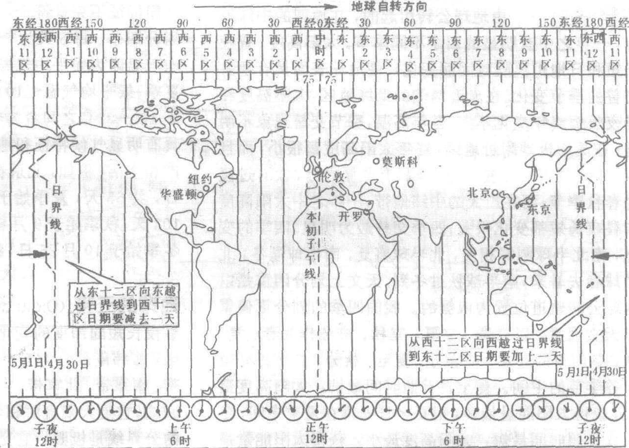 时区和日界线图 区时又称“标准时”。每一时区统一采用的中央子午线的地方平时。相邻时区时间相差一小时。目前中国统一采用的民用时为标准“北京时间”,即以东经120°经线为准的东8区区时。 |