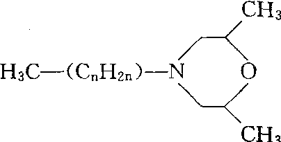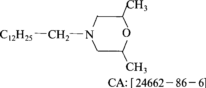 性能 纯品为无色油状液体,有轻微的氨味,沸点134℃ (66.6612帕),闪点142℃。20℃时,蒸气压为0.0127帕,在水中溶解度为0.1克/千克,溶于大多数有机溶剂。<50℃时密闭贮存2年不变质。低毒。原油大鼠急性口服LD50为558毫克/千克、急性经皮LD50>4000毫克/千克,急性吸入LC50为4.5毫升/升。对大鼠亚急性无作用剂量为50毫克/千克,狗为800毫克/千克,大鼠和小鼠慢性无作用剂量分别为80毫克/千克和90毫克/千克。在试验室条件下,220微克/千克的剂量,大鼠有致畸和繁殖毒性现象; 但在24微克/千克剂量下未见上述现象。无致突变和致癌现象发生。兼有保护和治疗作用。内吸性比较强,能被植物的根、茎、叶吸收。抑菌谱比较广,对担子菌、子囊菌和半知菌引起的多种植物病害有效,其作用机制为抑制麦角甾醇的生物合成。 应用 主要用于小麦、大麦白粉病、叶锈病、条锈病和黄瓜、豌豆、马铃薯、橡胶树白粉病,以及茶叶茶饼病等病害的防治,也用于橡胶树红根病的防治。防治橡胶树红根病以有效成分15~ 22.5克/株剂量灌浇施用,每六个月施药一次,共施六次。上述其他病害的防治均采用喷洒施药。 十三吗啉tridemorph又称克菌啉。杂环类杀菌剂。化学名称:2,6-二甲基-4-十三烷基吗啉。化学结构式如下。原药无色油状液体,能与水、丙酮、苯、氯仿、环己烷、乙醇等混合,密封条件下贮存二年不变质。1969年德国巴斯夫公司研制,选择性内吸杀菌剂。主要用于防治由白粉菌、锈菌等引起的病害,具保护、治疗和铲除作用。除用于谷物、花生等大田作物白粉病,锈病外,也用于橡胶等热带作物防治根腐病、白粉病。抑制菌体细胞麦角甾醇的生物合成过程中△8~△7的双键异构化,从而影响膜的形成,导致菌体死亡。它对三唑酮已产生抗药性的菌不发生正交互抗药性作用。对植物安全,大鼠急性口服LD50558 mg/kg,对鱼有毒。