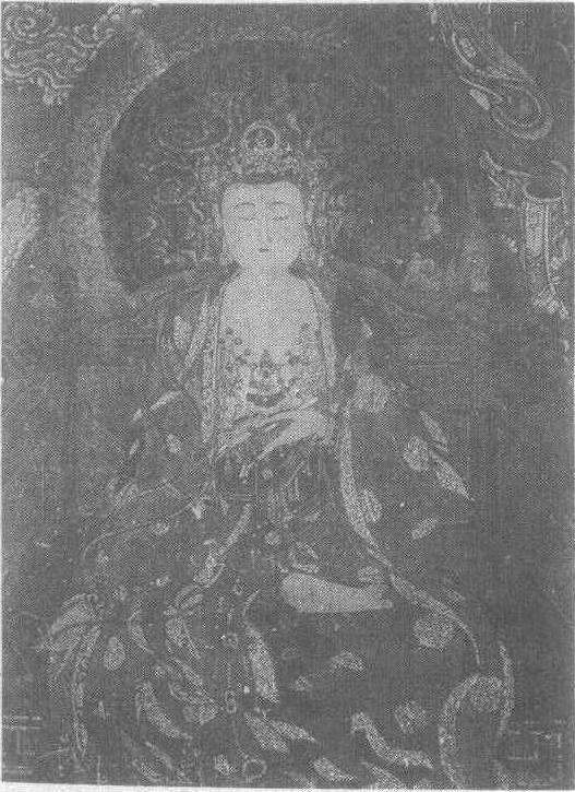 | 释义 | 十二圆觉菩萨像(圆觉菩萨)壁画明。纵182厘米,横130厘米。四川省新津县观音寺毗卢殿左壁第一铺第一幅壁画。菩萨端坐于龛座上,身后有缭绕祥云的圆形背光,头戴花冠,面庞丰圆。弯眉,细眼,高鼻,小嘴,双目低垂,似沉浸在佛国的深远意境之中。手中的经卷寓意能满足人们的乞愿。此画线条轻盈、自然,裸露于外的肌肤采用晕染法以增强立体感。以朱砂为主的衣衫,使用沥粉贴金的技法,使画面显得富丽堂皇,具有庄重,深沉的艺术效果。沥粉贴金见“帝释梵天图(帝释天)壁画”条目。