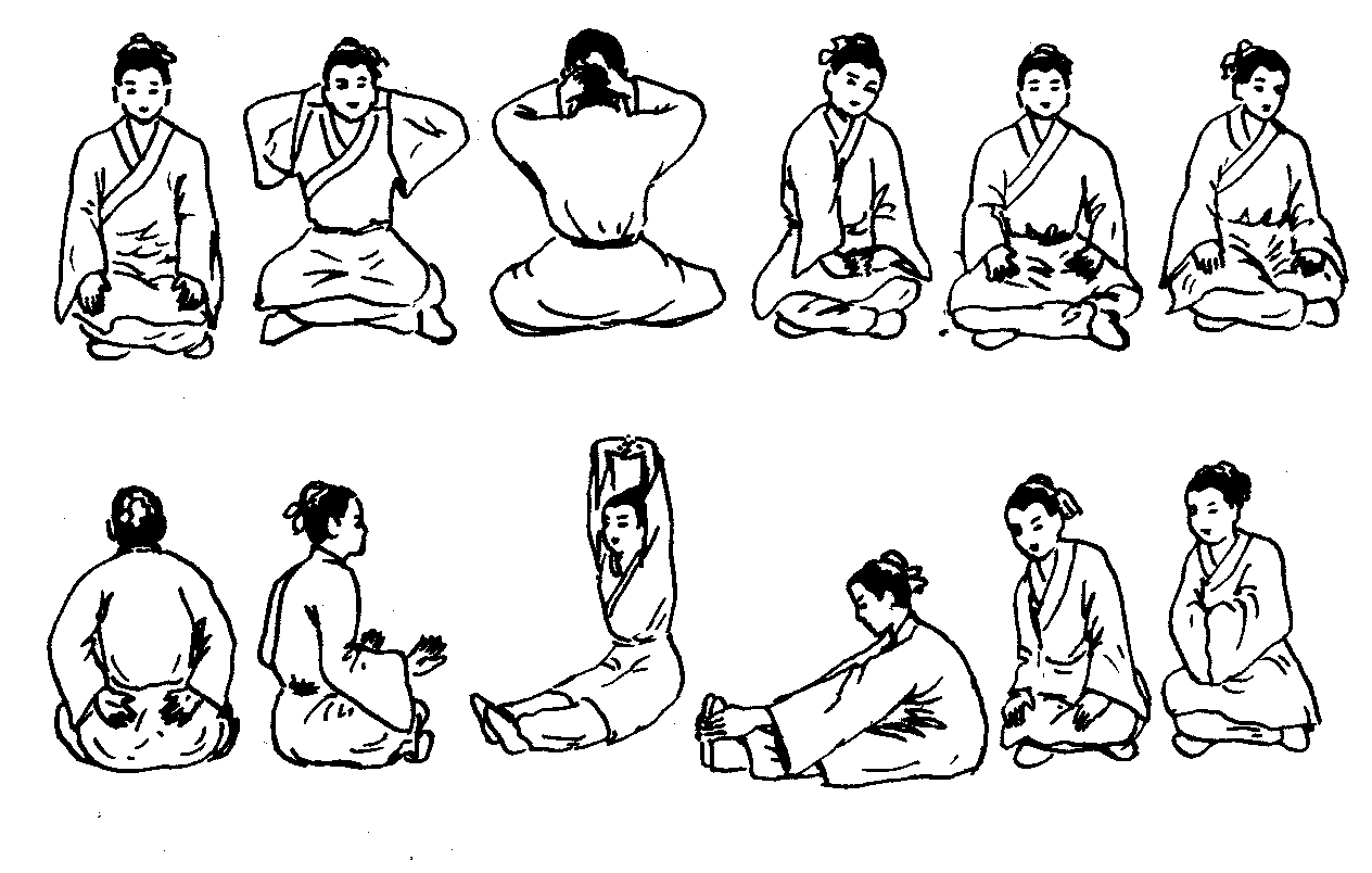 我国古代的一种健身方法。它的某些动作早在宋代以前就曾出现过,到明代朱权编撰的《活人心法》中才首载成套功法。流传最广泛的是明清时期,曾被誉为“上古遗法”、“古圣相传”。清王祖源编写的《内功图说》中详细地记载了整套动作过程。它的特点是以静辅动,意形并重。融冥想、吐纳、导引、按摩等多种练习方法于一体。十二段锦又称坐式八段锦。共有12式。第1式闭目冥心坐,握固静思神。两腿盘腿而坐,轻闭双眼,摒除心中杂念。脊椎松直,腰不可塌软,身不靠物。两手大拇指内扣于掌心,其余四指包握大拇指(此握拳法称“握固”,具有收心敛神之效)。两拳心向下,轻置两膝上,静坐养气。(图2—4—117—