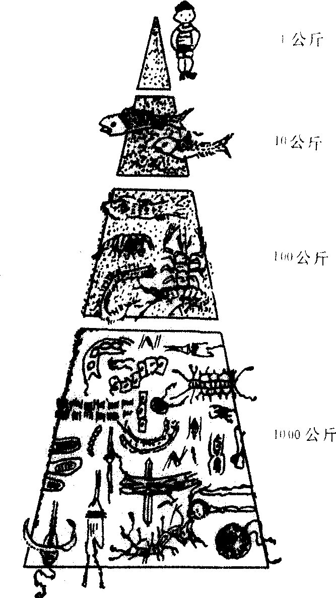 生态系统中各个营养级之间的能量关系,可以用一种金字塔形的营养级关系来表示。金字塔的底层是浮游植物,代表生态系统中的生产者,第2层是浮游动物——小虾等无脊椎动物,它们以浮游植物为食,把植物体内的有机物质转移到自身体内。第3层是鱼,它们吃浮游动物,以后,它们又成了人们的盘中餐,有机物就这样转移到人体内了。上述情况可用一个形象的比喻来概括:大约1000公斤浮游植物能生产100公斤浮游动物,而100公斤浮游动物又能转换成10公斤鱼,而10公斤鱼大致是人长1公斤肉所需要的食物。在生态学中,这个规律被称为“十分之一法则”,虽然该法则只是一个大致的估计,而且不那么精确,但它却能说明每经过一个营养级,能流的总量就要大大地减少一次。研究工作表明,在各营养级之间,能量转换的效率一般在百分之几至百分之二十几之间。