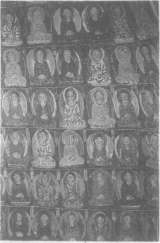 | 释义 | 千佛图壁画北凉。甘肃省肃南裕固族自治县文殊山石窟千佛洞西、南壁角壁画。壁面上方整齐地绘列着一排排坐佛,圆脸、大目、高鼻,面部多带平易近人的微笑,显得十分和善。身着各色通肩袈裟,结跏趺坐于莲座之上,双手放置腹前,作禅定印,身后的背光与袈裟颜色相配。壁面最底层绘一排立佛,其面形与上部的坐佛类似,双耳尤大,两腿分开站于莲台之上。此图风格古拙挺健,敦厚朴实,设色浓厚,人物肌肤的裸露部分,如脸颊、双目、颈部皆施以朱红晕染,以增强人物的立体感。作者在绘画时还注意人物特征的描绘,使初看基本相同的人物形象,实际有所变化。