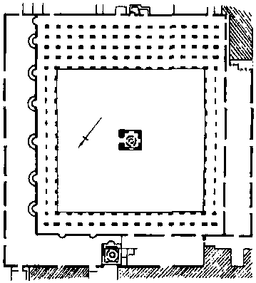 | 释义 | 826年埃及开罗建伊本·土伦清真寺 (图),用红砖砌成大殿方柱,寺内四周镶有木质饰带。殿里五列柱墩,横行走向。柱墩四角用小柱子装饰,柱墩之间用尖券连接,券面和券底均有灰塑的花边和几何纹样。为伊斯兰教重要古迹之一。
