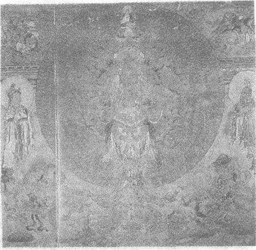 | 释义 | 千手千眼观音像壁画元。纵200厘米,横240厘米。甘肃省敦煌县莫高窟第3窟北壁壁画。千手千眼观音是观音菩萨降服魔鬼显现的一种神通变化,属佛教密宗图像。莫高窟在盛唐时开始出现千手千眼观音形象。此窟是敦煌现存唯一以观音为主题的洞窟。观音有多面,第一层正面主像面相丰满,富于弹性,面有三眼,高鼻,小唇,端庄秀美。颈佩项圈,披天衣,长裙飘洒。观音有千手,千手上各有一眼所组成的圆形,如同一轮圣光。此图发挥了各种线条的表现功能,肢体用遒劲的铁线勾勒而成,显得结实圆滑而富有生气。衣带用兰叶描,转折处用折芦描,笔势时而圆转时而劲拔,帛、绢、麻等各种衣料的质感和轻柔的飘垂感都生动地再现出来。此图人物造型、线描和敷彩都相当纯熟,标志着元代绘画的高度发展。