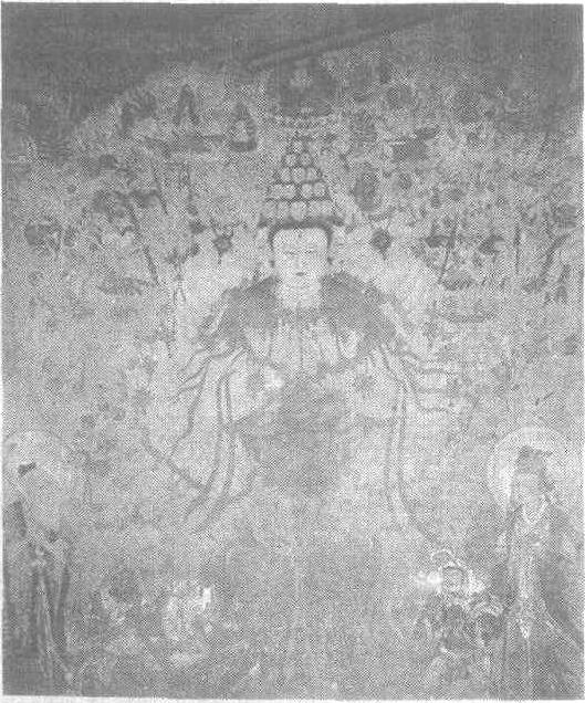 | 释义 | 千手千眼观音壁画金。纵573厘米,横491厘米。山西省朔县崇福寺弥陀殿南壁壁画。千手千眼观音是观世音的化身,其形象常见于佛教壁画和塑像。此像为18面。正面的主要一面脸形丰圆,五官小巧,神态庄重,具有时代风格。观音的18面之上顶一莲花座,座上的小佛结跏趺坐,施弥陀印,身上的红色袈裟鲜艳夺目。观音的千手掌心皆有一眼,手持不同的法器,手姿多态,无一雷同。腹前的四手共捧一钵,钵内矫龙翻腾。整个画面描绘精致,人物线条纤细,设色艳而不俗,气势可观。