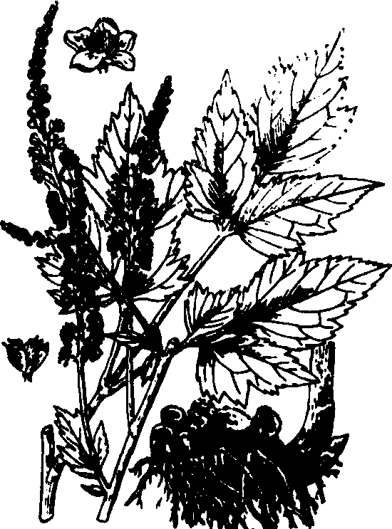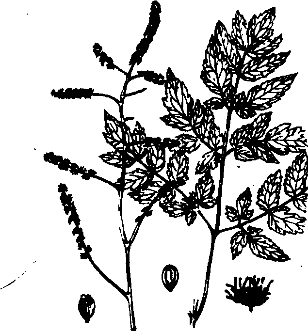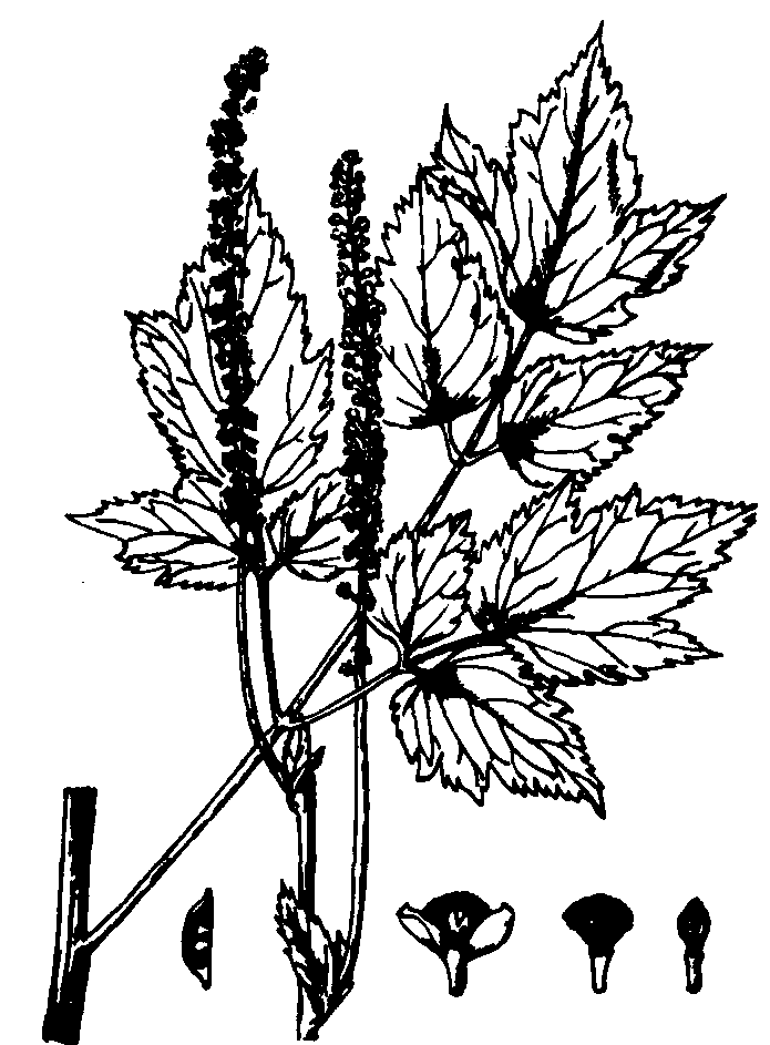 图3 大三叶升麻 升麻fetid bugbane,skunk bugbaneCimicifugafoetida L.,毛茛科,升麻属。多年生草本。生于山地林缘或草坡。分布于云南、四川、青海、甘肃、陕西、河南和山西南部等地;俄罗斯也有分布。根状茎粗壮,黑色,密被棕色短柔毛。茎下部叶为2~3回羽状复叶,有长柄,小叶常5~7枚;顶生小叶有长柄,常3裂;侧生小叶较小,有短柄,边缘有不规则锯齿。圆锥花序;花两性;萼片白色,5枚,花瓣状,早落;花瓣小,广椭圆形,1~8枚;雄蕊多数,心皮2~5枚,均离生。聚合蓇葖果。根状茎及根药用,能解热透疹,解毒净血。煎水含漱,治口内炎。又可制农药,用水煮汁喷洒,可杀伤马铃薯块茎蛾。 |