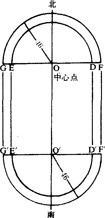 ❷由中心点向南、北各量42.98米,分别定为O点与O′点,即两端弯道的圆心。