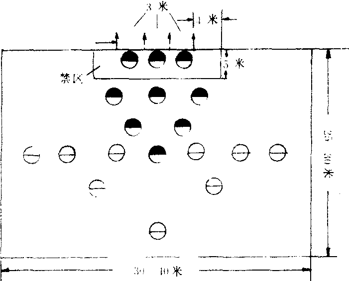 半场小足球 (每队9~11人),先确定攻队守队。守队选出3人作守门员(分别站在3个球门前,不得集中站立),其余与攻方队员一齐分散站在场上。发令后,由攻队队员从中场踢球入场开始比赛。在规定的时间内,守方通过抢、断、拦截球破坏对方的进攻;攻方通过传、带球,设法踢球入门(攻进3个门中的任何一个,就得1分)。到时间,双方交换攻守。最后以得分多的队为胜。游戏规则:❶攻守双方都不得推、拉、绊人,否则可以停止其游戏资格。❷除守门员外,都不得用手触球。 ❸射门时,球高不得超过守门员身高。不得进入禁区射门,否则射中无效。 |