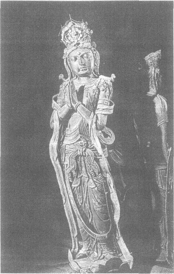 华严寺菩萨彩塑 华严寺位于山西省大同市内西南隅。大殿坐西向东,打破一般佛寺坐北朝南的惯例,体现了契丹族东向为尊的习尚。现有两组建筑隔路相望,以大雄宝殿为中心的 一组称上华严寺,以薄伽教藏为中心的 一组称下华严寺。薄伽教藏殿初建于辽兴宗重熙七年(1038年),殿内现存辽代彩塑29尊,表现“三世诸佛,十方菩萨,声闻、罗汉,一切圣贤”。殿内塑像全部妆彩,面部、冠上贴金,妩媚动人。这尊菩萨头戴贴金宝花冠,长圆脸,高鼻梁,方口微启,双目半眯,细长眉形如初月。上身半裸,肩披曳地长巾,双手合十举于胸前如若祈祷。身躯呈S形站立,赤足踏莲花,下身穿拖地彩裤,腰系彩带。辽塑继承唐代雕塑的传统,崇尚华巧、雄健,同时融合本民族的审美习惯,形象细目高鼻,带有契丹族人的特点。 |